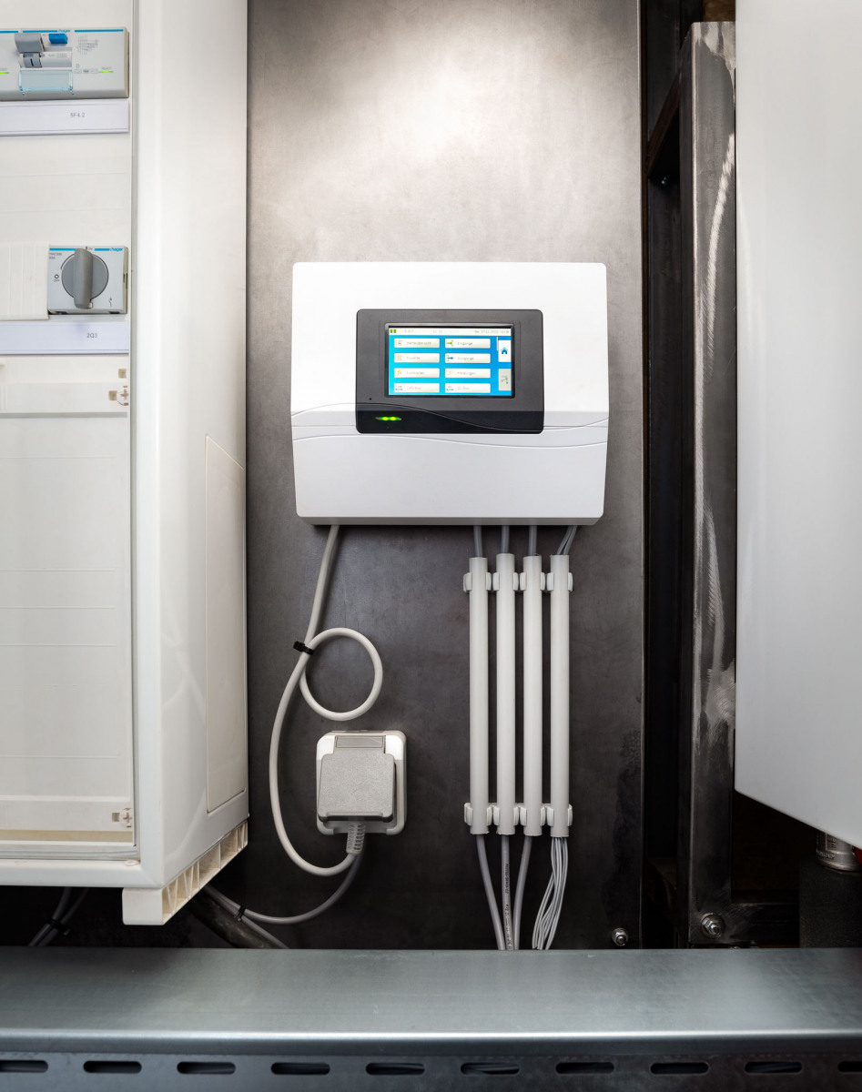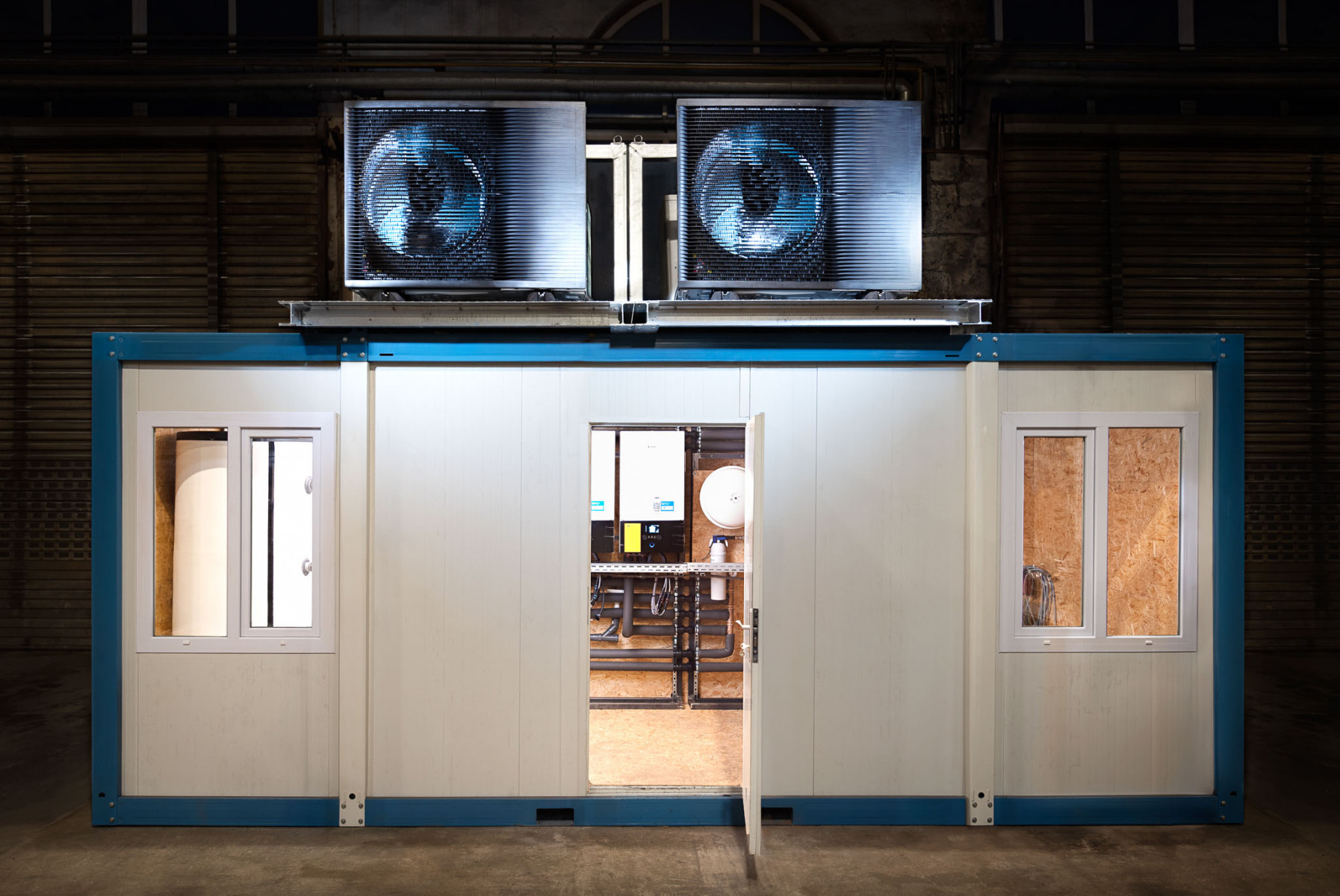 Fotografie von Innen- und Außenansichten eines Haustechnikmoduls mit vier auf einen Container montierten Wärmepumpen. Der Prototyp wurde von einem Konsortium Mittelständischer Handwerksbetriebe für einen weltweit tätigen Hersteller von Heizungs- und Klimatechnik angefertigt.